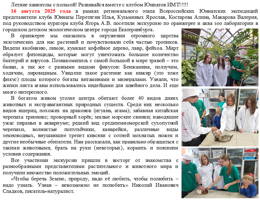 Команда «Юные натуралисты ИМТ» в составе: Перетягин Илья группа №328-П специальность 15.02.16 Технология машиностроения (профессионалитет), Кузьминых Ярослав группа №329-П специальность 15.02.16 Технология машиностроения (профессионалитет), Макарова Валерия, Костарева Алина группа №327-П специальность 09.02.07 Информационные системы и программирование (профессионалитет), и обучающиеся Сартаков Сергей, Пелевин Кирилл группа №330 специальность 23.02.02 Автомобиле и тракторостроение, под руководством куратора клуба «Юннаты» Ягорь А.В., принимает участие в муниципальном этапе Всероссийских юннатских экспедиций проводимого Общероссийским общественно – государственным движением детей и молодежи «Движение Первых».